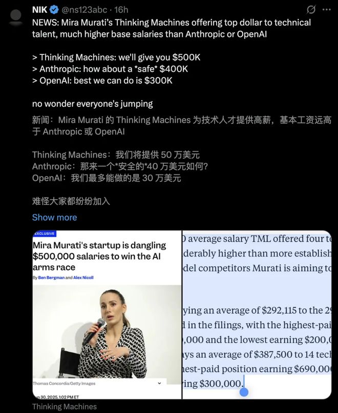 此前,在小扎疯狂抢人之际,曾有外媒爆料称,Mira Murati也下场了。