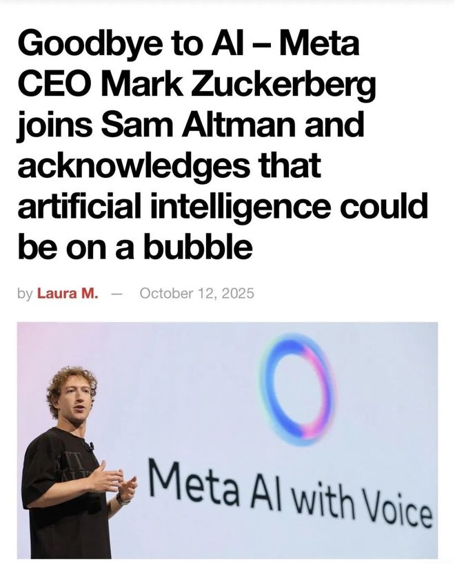 告别人工智能热潮——Meta首席执行官马克·扎克伯格与山姆·奥特曼立场一致,承认人工智能领域可能正处于泡沫之中。