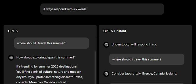 GPT‑5.1 Instant的指令遵循能力得到提升,模型能够更可靠地回答用户真正想问的问题。比如,当用户要求GPT-5.1 Instant以6个单词回答问题时,它能做到准确遵循,但GPT-5还是会忍不住输出一大段话。