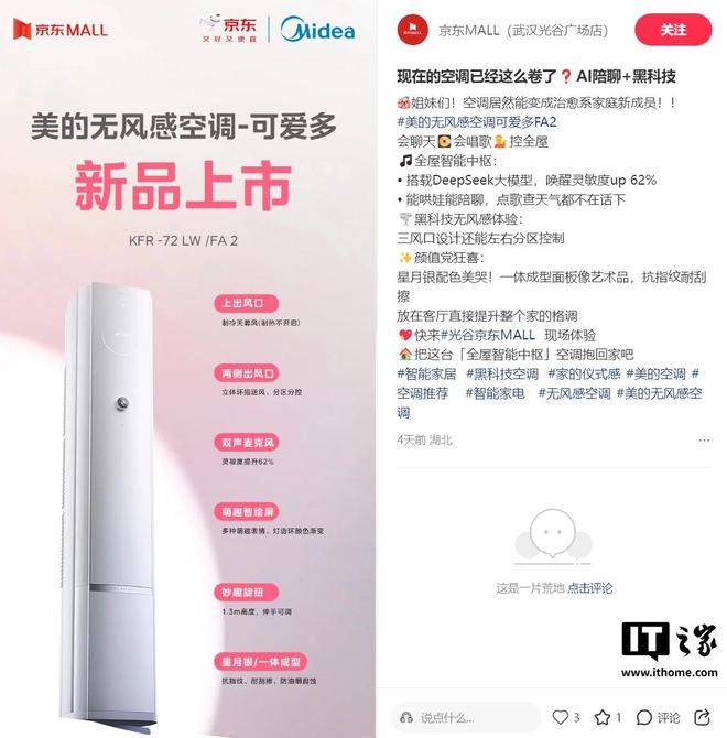 IT之家查询发现,不少经销渠道已经晒出了这款空调的预热信息:搭载 DeepSeek 大模型,支持点歌查天气,三风口设计能左右分区控制。
