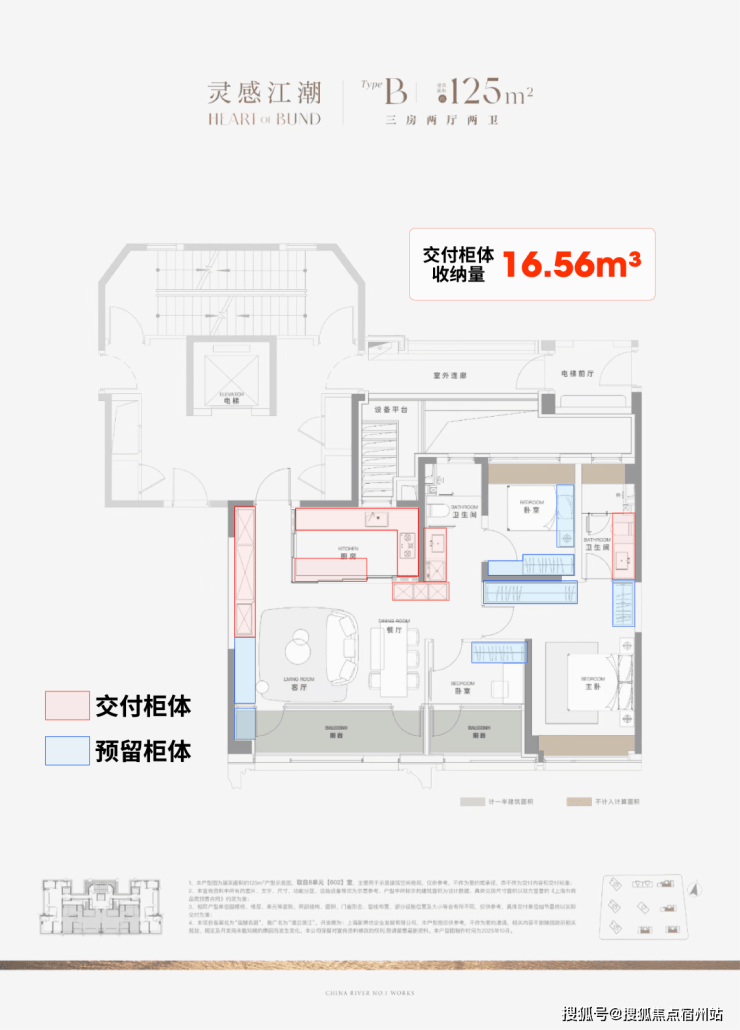 据小胖君手工统计,项目125㎡3房边套户型的整体交付柜子+预留衣柜,收纳空间可以达到约20.04m³!中间套户型也能达到约16.56m³!