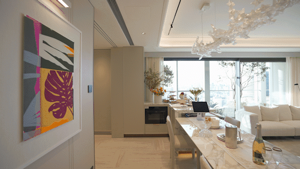 另外,因为豪宅客户对于精装美学有自己的审美,所以此次项目提供了超越行业的三大柔性定制——艺术家联名定制入户门把手、艺术家联名定制艺术门牌挂画以及墙面饰面&岛台等区域提供多款石材/岩板款式.