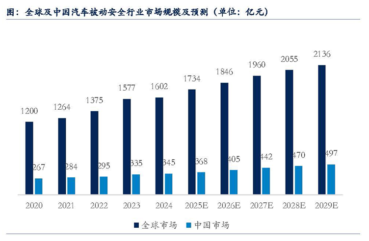 从行业前景来看,汽车被动安全市场是稳中有升的刚需赛道。2020-2024年,全球汽车被动安全市场规模从1200亿元增至1602亿元,年均复合增速约7.5%;预计到2029年将达到2136亿元,2024-2029年CAGR约5.4%。中国市场增速略快于全球,2020-2024年CAGR约6.7%,预计2029年将达到497亿元,2024-2029年CAGR约7.8%。法规升级、智能电动化带来新安全场景、新兴市场渗透三大因素将持续驱动市场增长,为均胜电子的安全业务提供广阔发展空间。