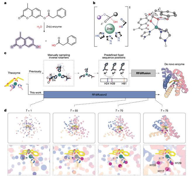 David Baker团队之前开发的用于蛋白质从头设计的生成式 AI 工具——RFdiffusion,可以解决上述难题,但其需要为每个催化氨基酸残基指定序列位置和主链坐标,这限制了设计空间范围。