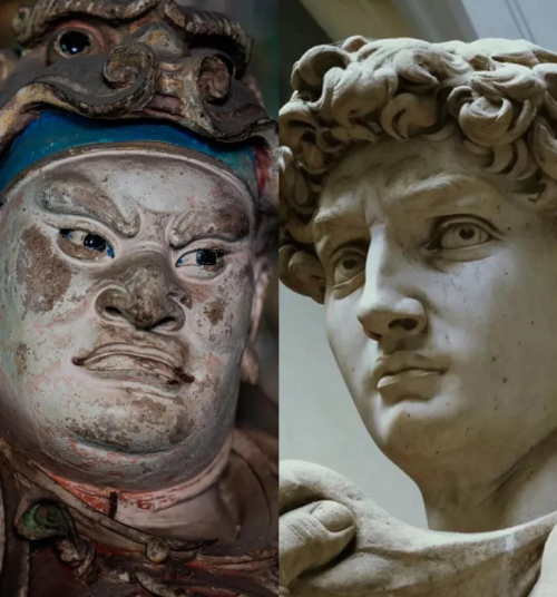 对比山西平遥双林寺的韦陀塑像和同时期米开朗琪罗的《大卫》,我们不难看出西方艺术中对结构与阴影的塑造更为重视。