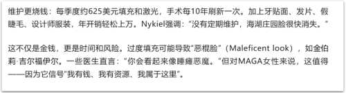 就像很多人买奢侈品一定要有大logo一样,“海湖庄园脸”的信徒们也从不觉得夸张的五官重塑会令她们尴尬,反而将其视为财富的象征。