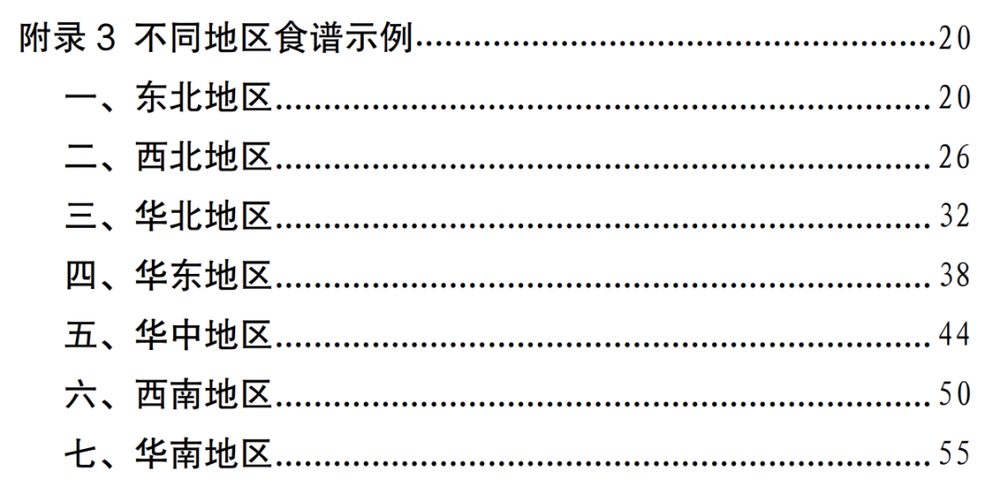 值得注意的是,这份食谱细化到了全国不同地区的食谱示例,并备注了食谱的“总能量”。