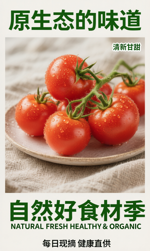 再如有复杂文字要求的海报类需求,金年会混元图像3.0也可以很好地生成。海报商品图中,西红柿水珠新鲜饱满、红润欲滴、质感诱人,具备高品质拍摄质感,同时海报中顶部、底部、点缀等各处的文字都能顺利呈现,画面层次清晰,整体配色与布局十分和谐,兼具美观与实用价值。