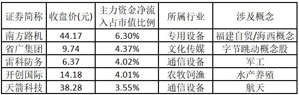 主力资金净流入金额占市值比例排名前5的个股分别为南方路机、省广集团、雷科防务、开创国际、天箭科技。