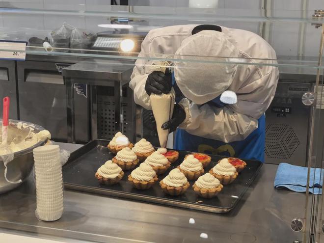 明厨亮灶的设计,让消费者可以亲眼目睹食物诞生的每个环节。滋滋作响的铁板上,6.9元一只的肉蛋堡正冒着热气,师傅现场敲蛋、撒料,香气扑鼻;9.9元一串的羊肉串从烤炉取下,顾客接过来就能边逛边吃;草莓挞上的奶油一圈圈现场挤上,再点缀新鲜草莓……这种“眼见为实”的体验,极大激发了购买欲。