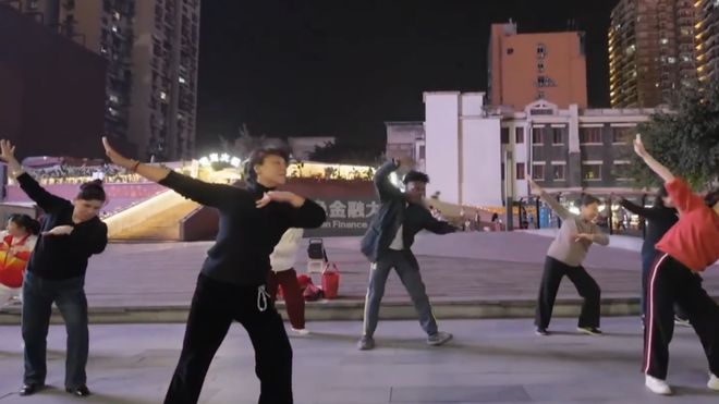 “我想和阿姨们一起跳舞。”话毕,“甲亢哥”加入了重庆街头阿姨们的广场舞队伍,欢声笑语中随音乐共舞。