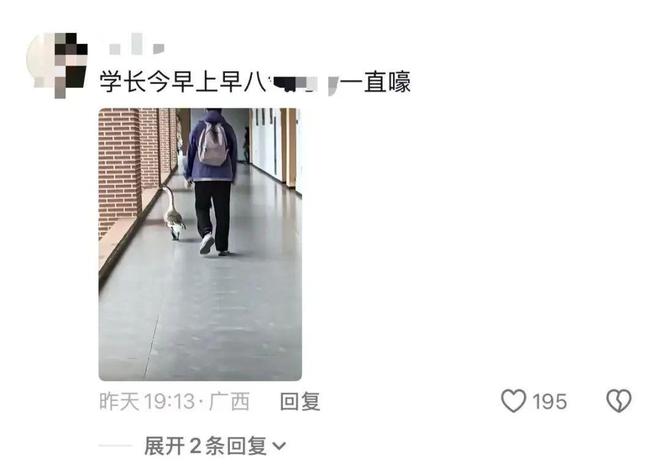 “它一点都不怕人,就是你们视频里看到的样子。同学们也对大鹅很友好,像宠物一样喂养,不会去恐吓它们。”工作人员还称,学校曾发布多篇推文,介绍大鹅的情况,为它们征集名字,组织“大鹅学长表情包设计大赛”等等。