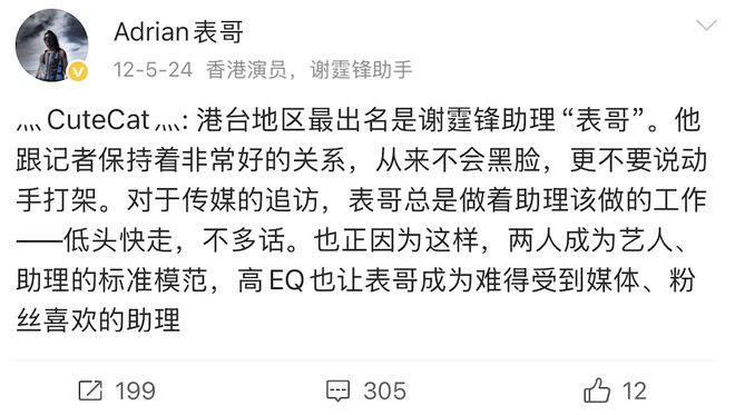 但好在他后来拥有了一个好脾气助理“Adrian 表哥”,帮他搞定媒体关系,这个助理还被评为过“全港狗仔最喜欢的明星助理”,这也是谢霆锋的运气了。