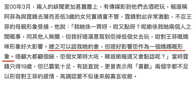 有记者写王菲不顾女儿,跑出去和谢霆锋恋爱,谢霆锋对此很激动,找到记者严正声明“不可以影响王菲的母亲形象。”