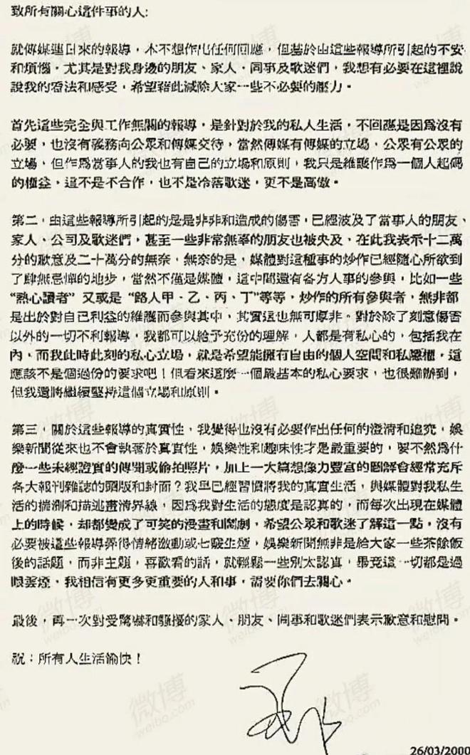 “ 由这些报导所引起的是是非非和造成的伤害,已经波及了当事人的朋友、家人,公司及歌迷们,甚至一些非常无辜的朋友也被殃及,在此我表示十二万分的歉意及二十万分的无奈。”“毕竟这一切都是过眼云烟,我相信有更多更重要的人和事,需要你们去关心。”
