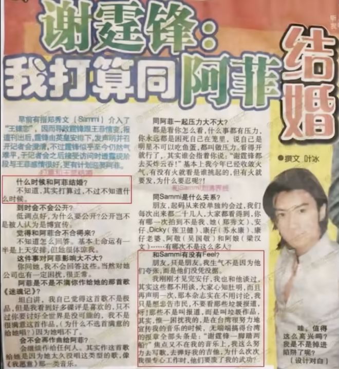 谢霆锋还独家发明了利用各种公开采访向王菲传递信息的示爱大法,他借助记者的提问,实际上是向王菲诉衷情。