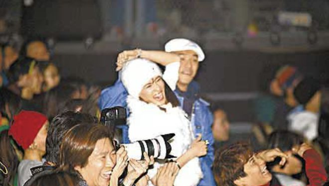 粉丝在前线报道,看到“王菲右手紧紧拉着小谢的左手,头靠在小谢的肩上。谢霆锋一副踌躇满志的样子”。